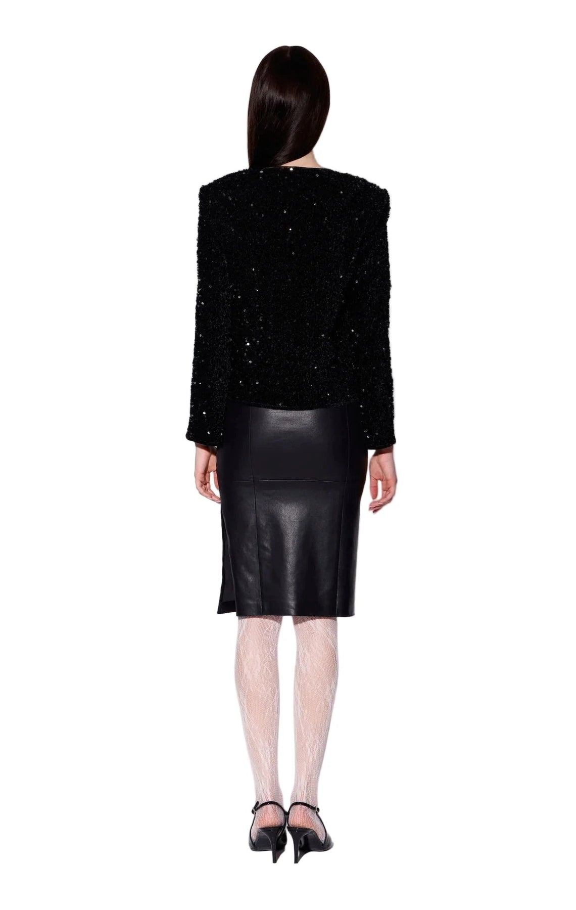 Add instant glamour to any outfit with the Walter Baker Janelle Jacket, a chic cropped layer finished in dazzling black sequins. Its short, easy fit and 3/4 sleeves strike the perfect balance of sparkle and sophistication—ideal for parties, events, or elevating everyday looks.