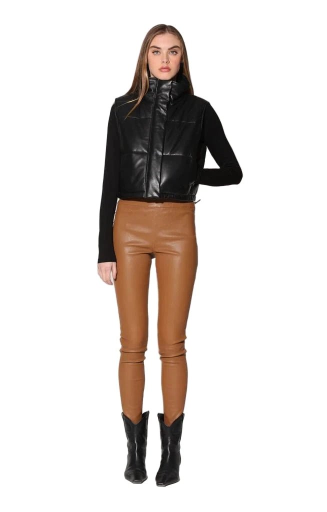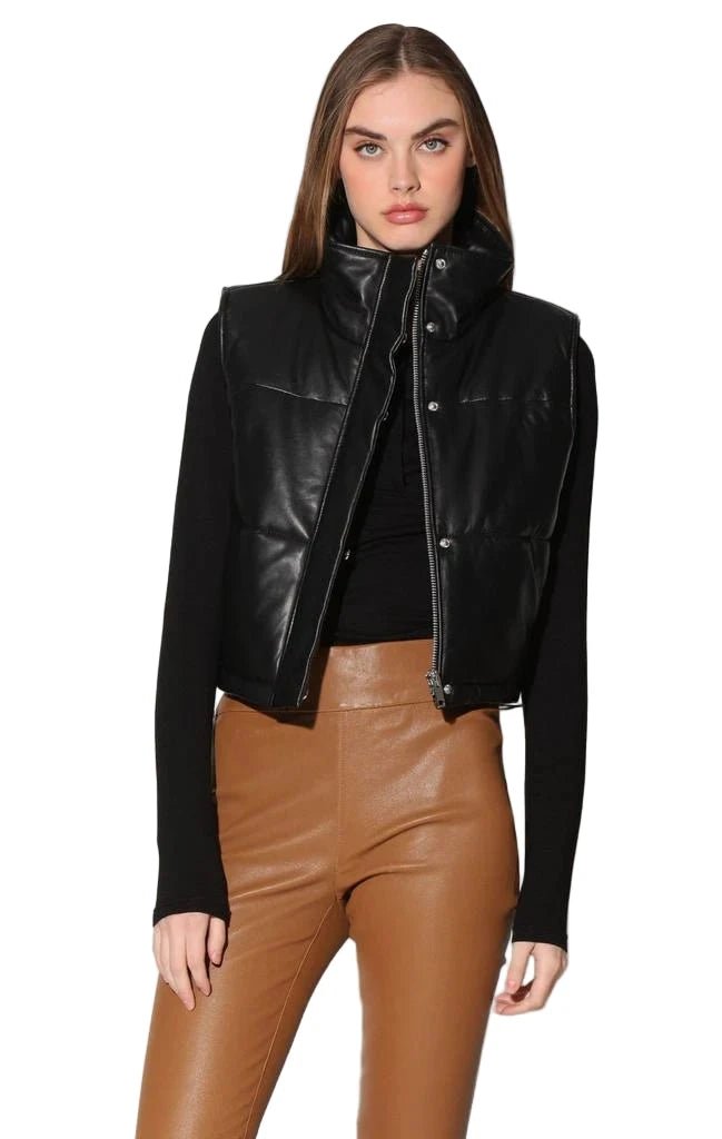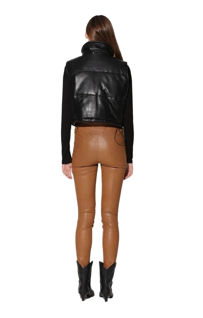 Walter Baker’s Jovie high neck leather vest features a sleeveless design with a button front and vertical welt waist pockets. The boxy fit is enhanced by an elastic cord-lock waistband, offering a chic and adjustable silhouette.