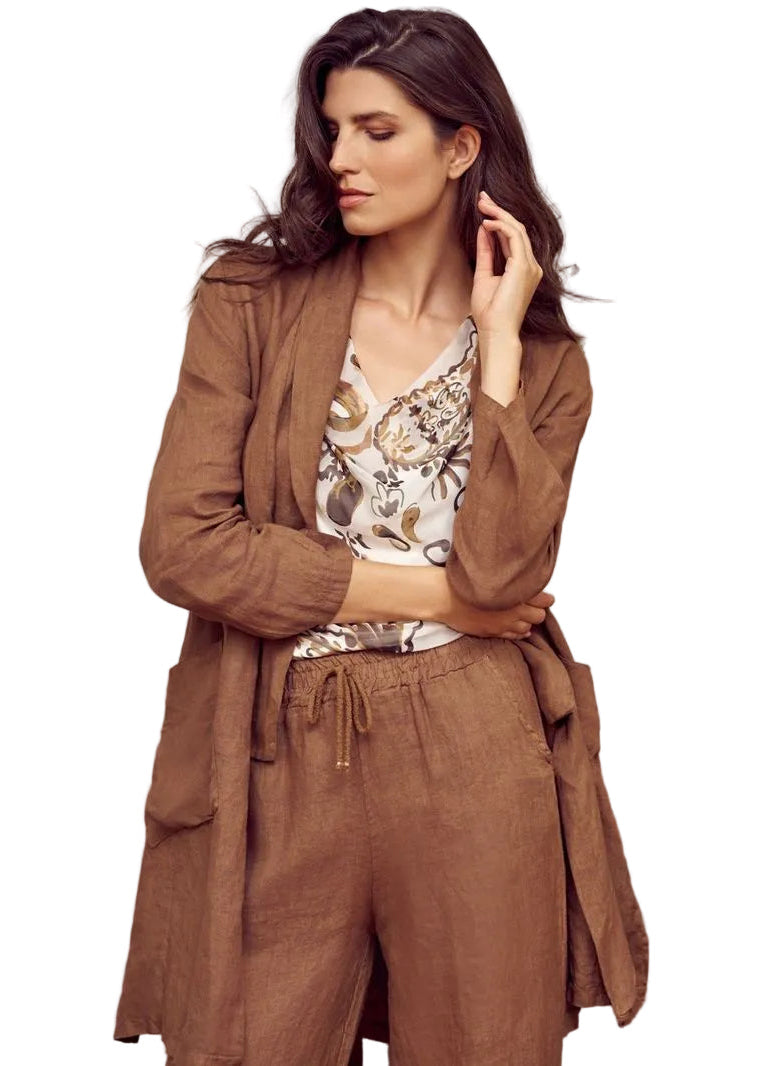 Designed in Montreal, the mocha-hued jacket pairs beautifully with the M Made in Italy Linen Pant for a coordinated, chic ensemble, or can be styled over dresses, blouses, and tees for versatile everyday wear. Its relaxed yet tailored silhouette makes it ideal for casual outings, office styling, or polished seasonal layering.