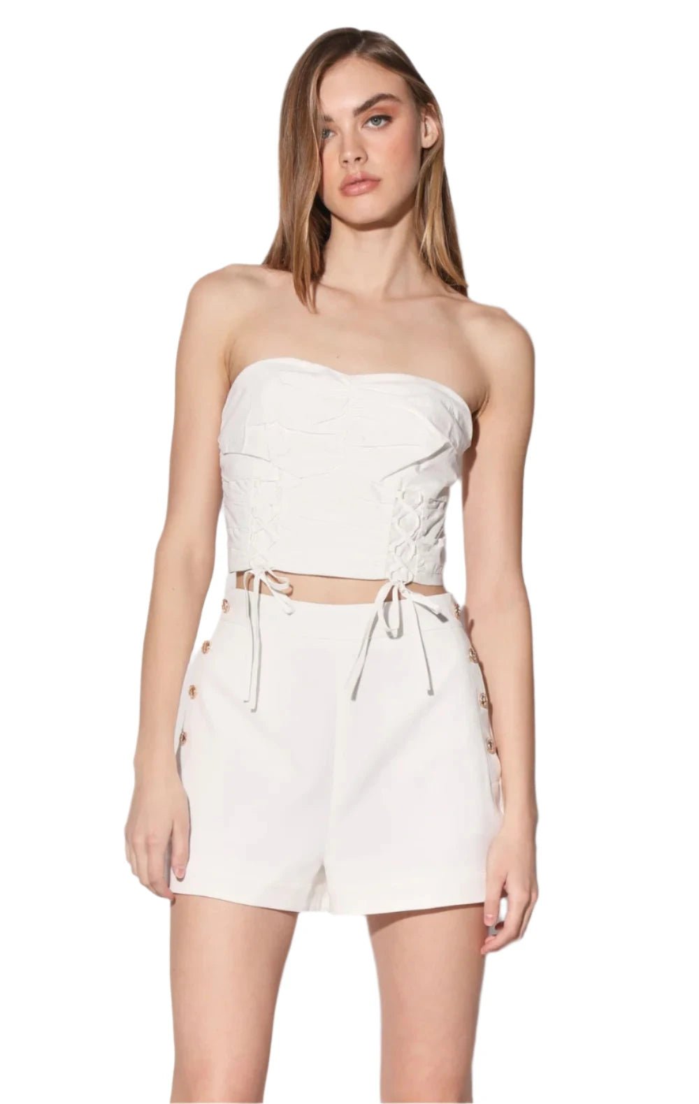 With its wide waistband and gold buttons accents, the Dawson Short, will be your new go to! Wear it with the Dionne Jacket for a chic set